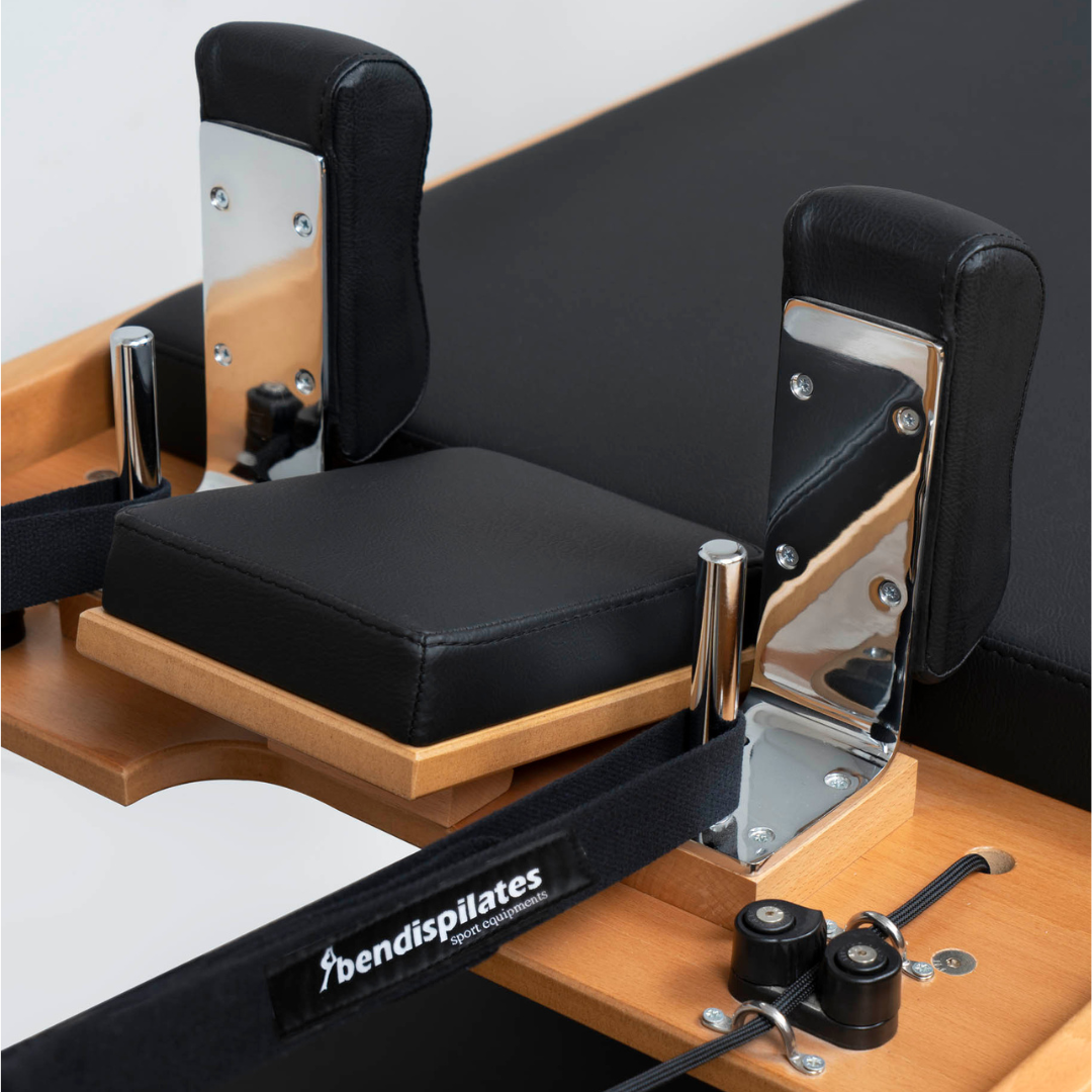 It consists of a platform that is called the carriage and is attached to one end of the reformer by a set of springs. The springs allow you to adjust resistance to the carriage, which will be pushed and pulled along the frame by your own body weight and strength. There are also shoulder blocks on the carriage that keep you in a stable position so that you’re not sliding off of the end of the reformer .