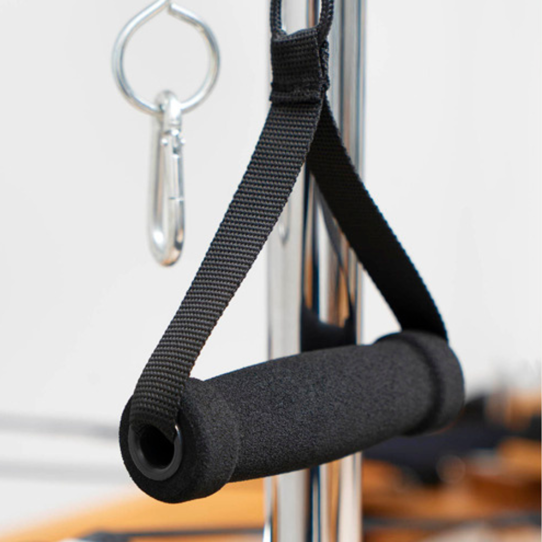 There is a footbar at the end of the reformer — an adjustable bar that holds the springs. Your feet and hands can be placed on this bar depending on the exercise. The reformer also has long straps with handles on them that your feet or hands can be placed in to; these are at the top of the frame opposite of the footbar. The springs can be adjusted to affect both the footbar and the handles, to modify the workout for different skill levels and body types. In fact, the reformer is used not only by people looking to strengthen their core, but also by dancers for training and injury rehabilitation.