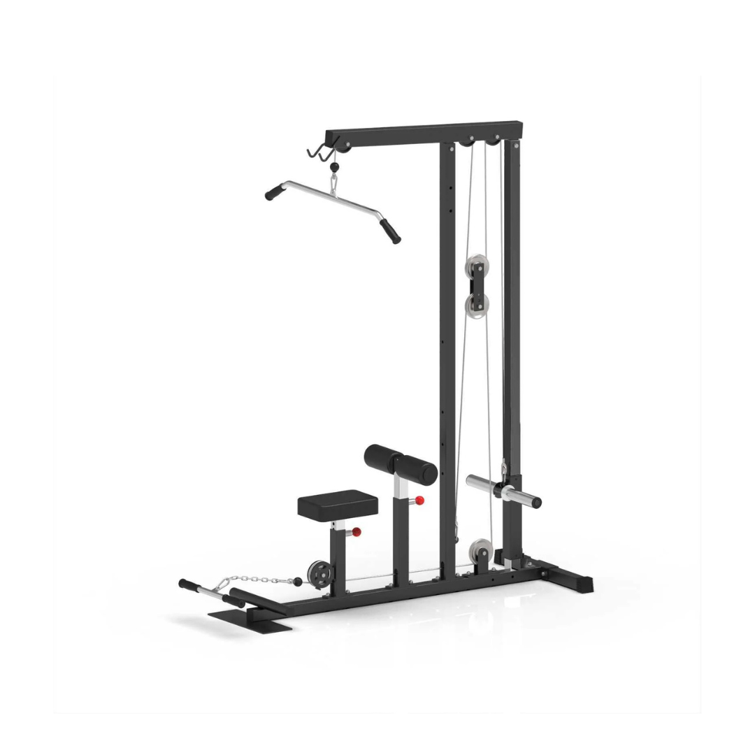 Built with a robust steel frame and aluminium pulley wheels, it provides commercial-grade durability and performance. The adjustable seat and padded thigh hold-down ensure comfort and stability for users of all sizes, while the dual cable system allows for lat pulldowns and low rows. Additional features include resistance band pegs for added versatility and compatibility with various cable attachments, including the included 120cm lat pulldown bar with rubberised grips and double-grip V handle.
