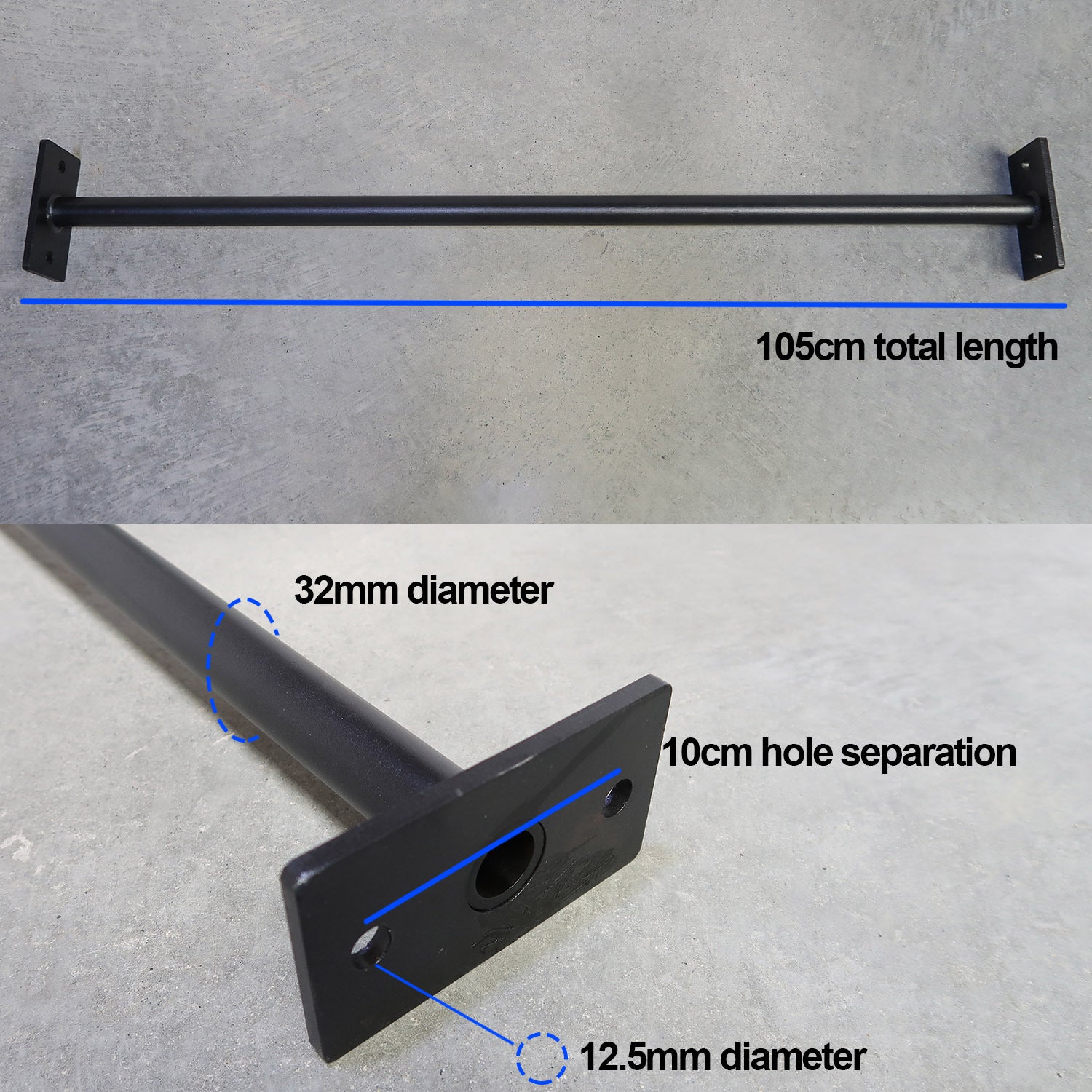 Compatible with a 75mm x 75mm rig uprights, on any existing Armortech V2 Rig. This 4ft Monkey Bar comes standard with 32mm diameter, and black powder coating to prevent rust and provide textured grip for pullups. The actual bar length is 105cm, end to end.