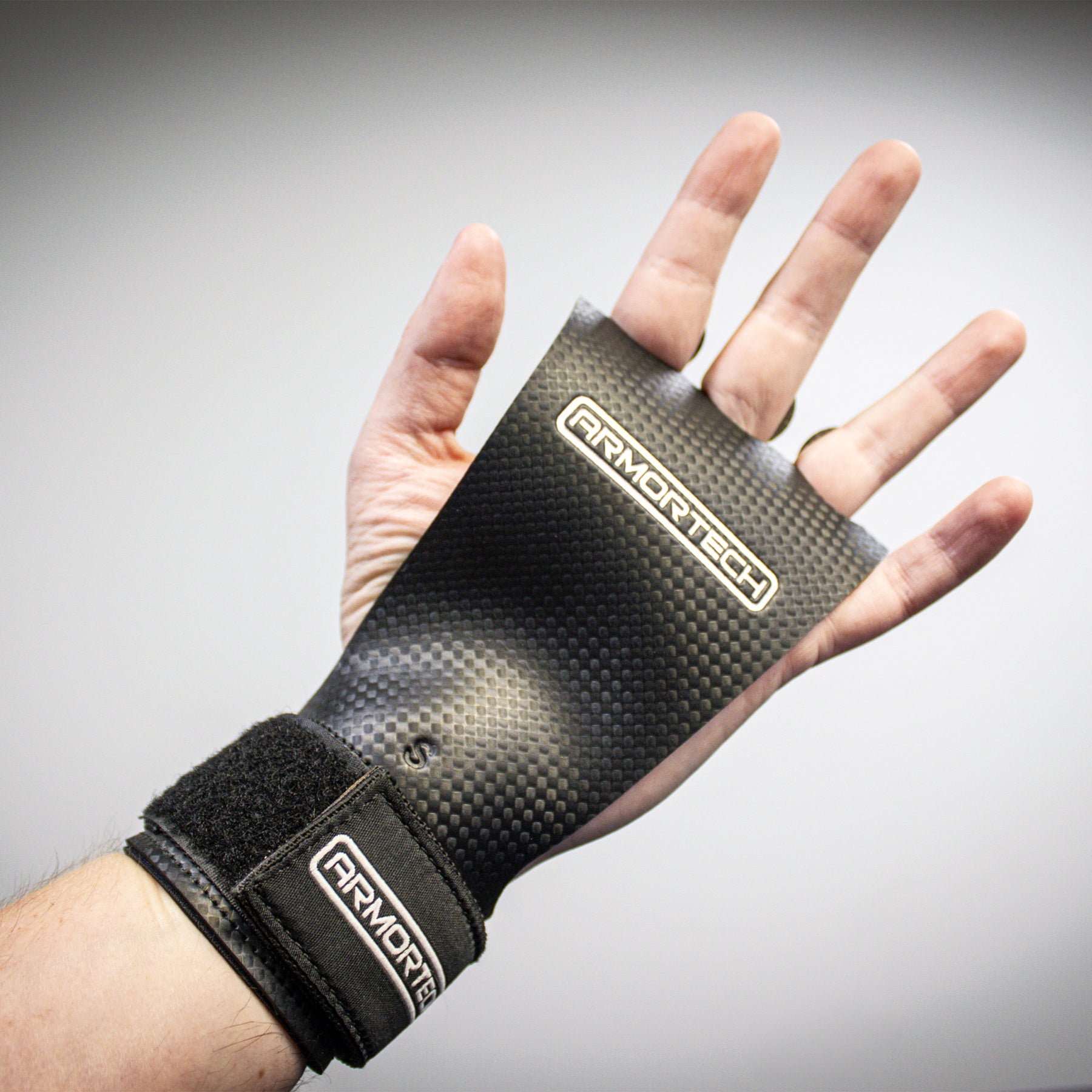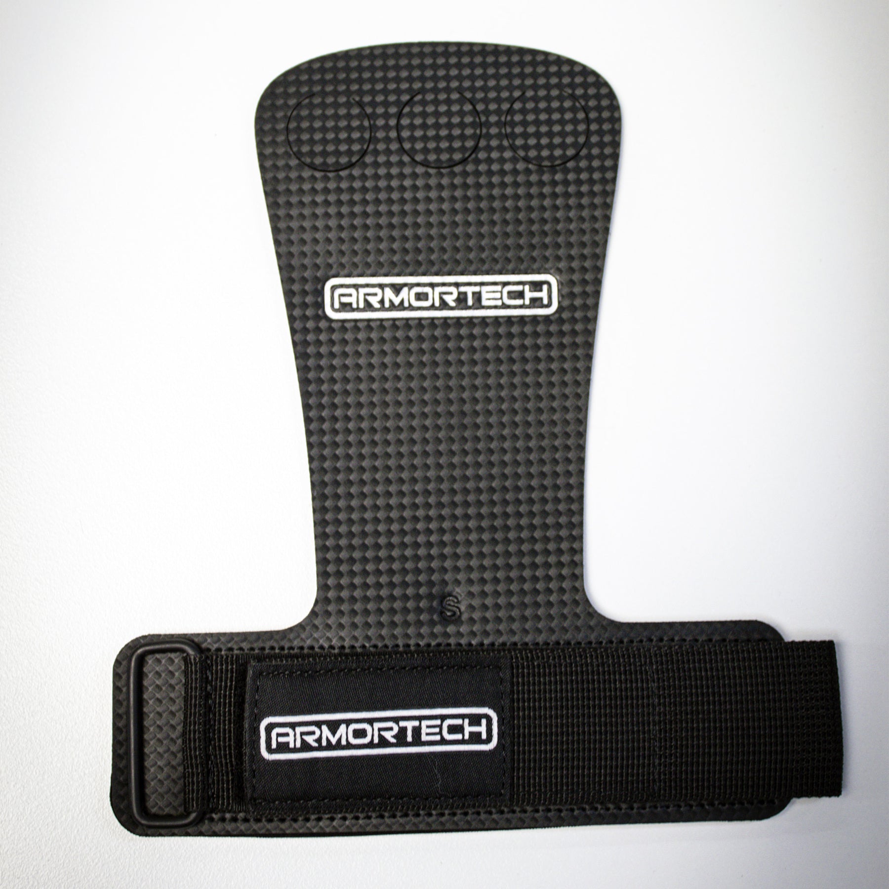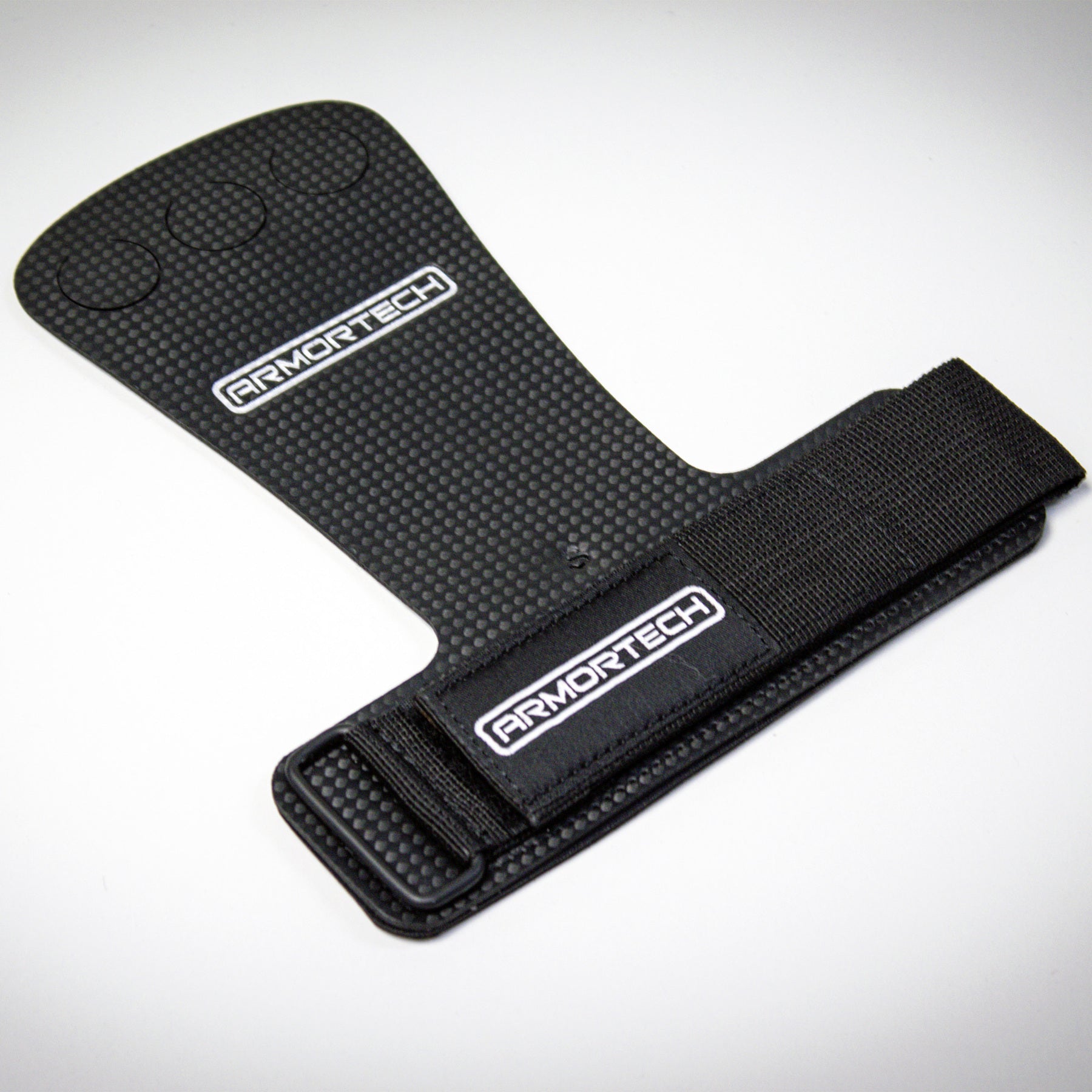 This unique, patented Carbon Comp design from Armortech offers athletes a 3-Hole Hand Grip specifically suited to slick and powder-coated bars and handles. Even without chalk, these triple-stitched carbon fibre grips create a consistent stick, helping prevent slipping while also protecting your hands/palms during pull-ups, muscle-ups, kettlebell swings, deadlifts, snatches, and just about any other movement known to cause rips and abrasions.
