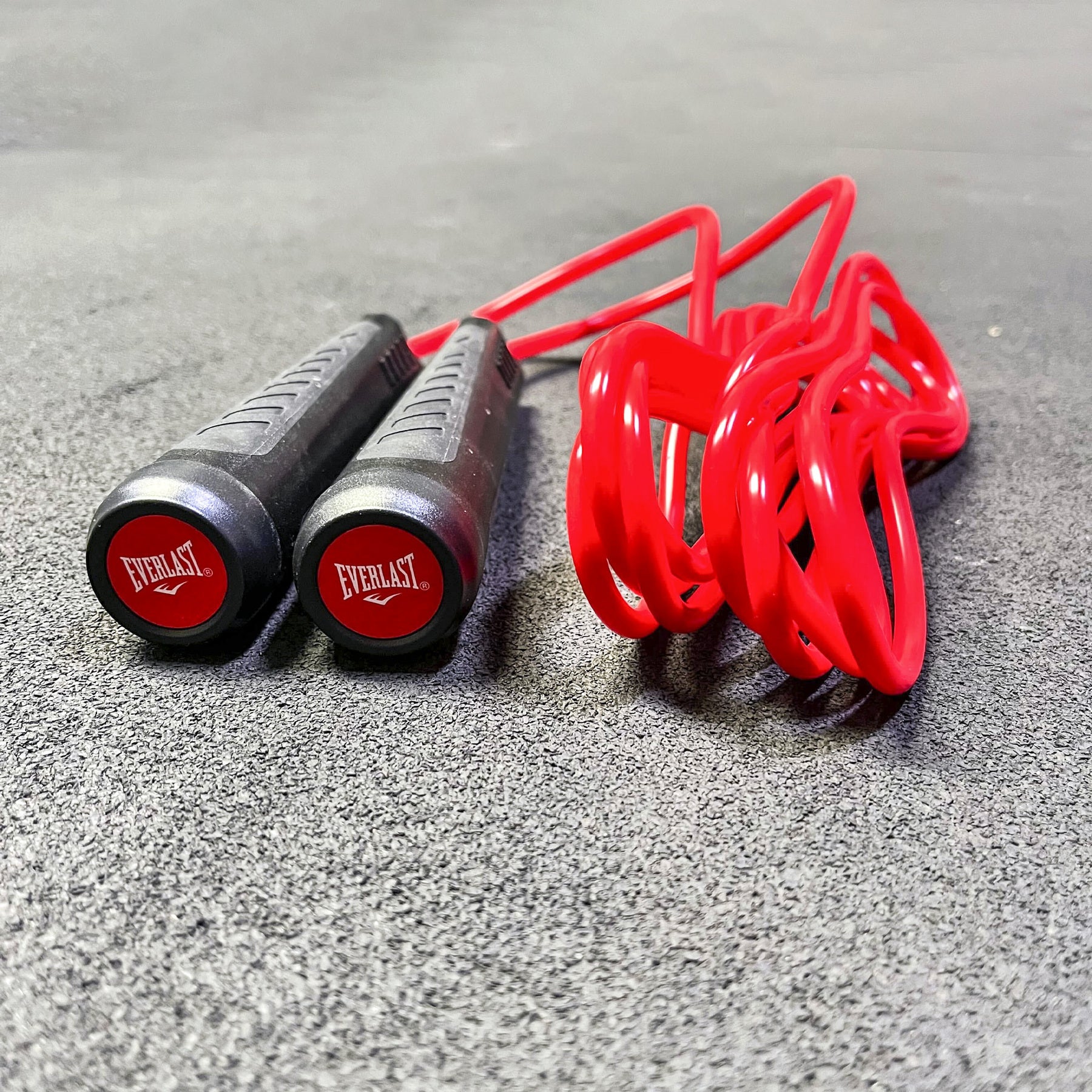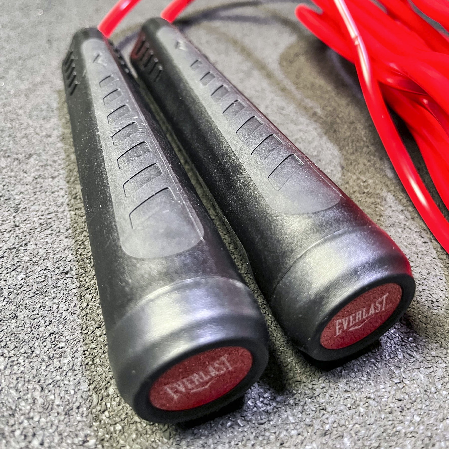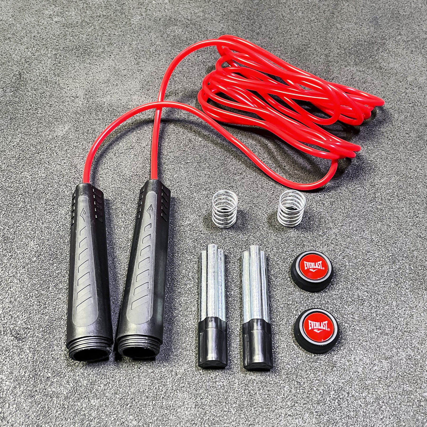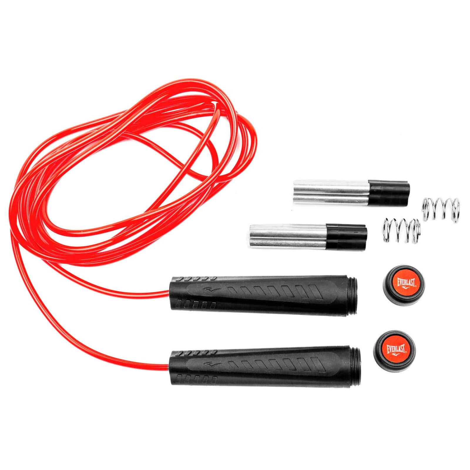 The Everlast Adjustable Weighted Jump Rope offers a highly customizable classic conditioning exercise used to tone muscles and burn calories. Easily toggle between three different weights from 40g to 120g for a tailored workout. Trimmable 11ft rope fits athletes of all sizes and integrated precision ball bearing rotation joint allows for both speed and agility footwork training without losing rotation. Customize your jump rope workout with the Everlast Adjustable Weighted Jump Rope.