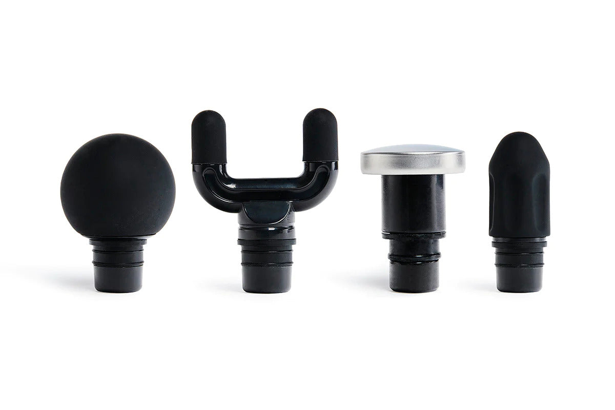 Our FASCIA GUN comes with four interchangeable massage heads or attachments which offer a large variety of massage options for any specific application needs: