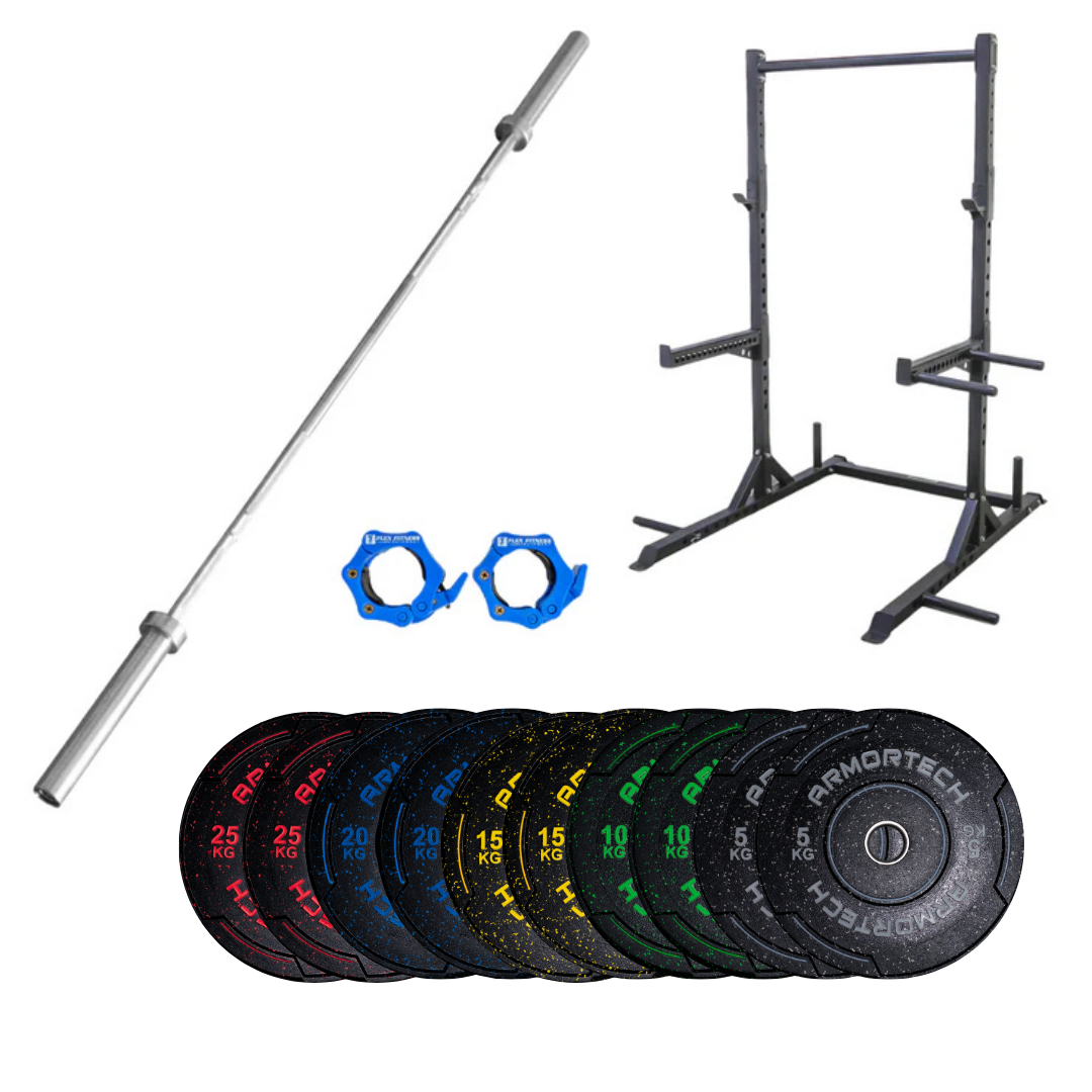 Take your home strength training to the next level with the SR4 Power Package 2. This complete package provides everything you need for safe, effective, and versatile barbell workouts, combining a heavy-duty squat rack, Olympic barbell, bumper plates, and quick-lock collars.